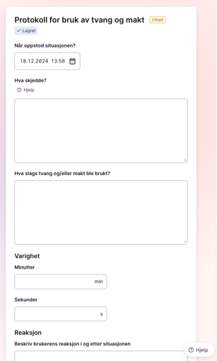 - Velg Protokoll for bruk av tvang og makt for å dokumentere en hendelse hvor det ble brukt tvang eller makt.