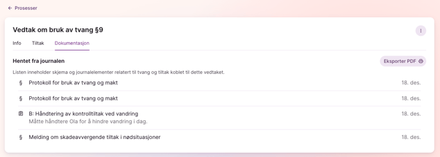 Ved innsyn kan all informasjon knyttet til tvang enkelt hentes frem fra tvangsprosessen under fanen Dokumentasjon. Her finner du alt av dokumentasjon fra tilknyttede tiltak på ett sted samt eventuelle enkeltmeldinger. Du kan eksportere alle dokumentene som PDF, eller skrive ut all dokumentasjon, ved å velge Eksporter PDF