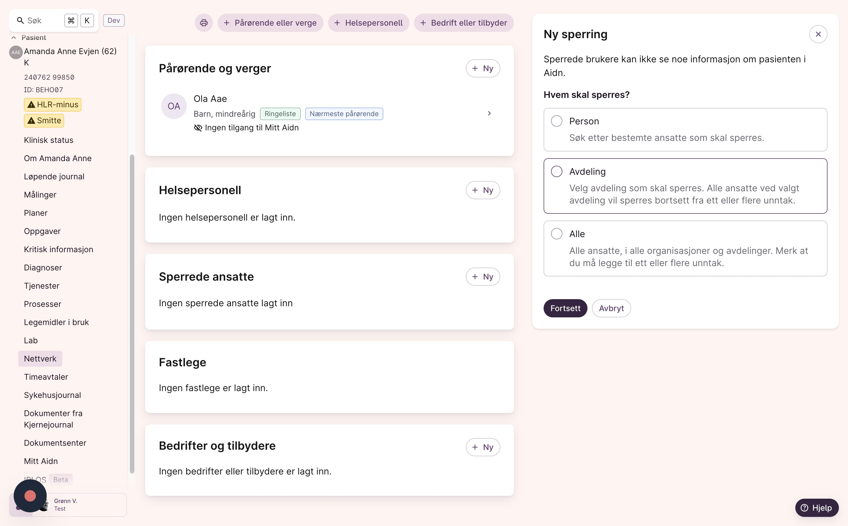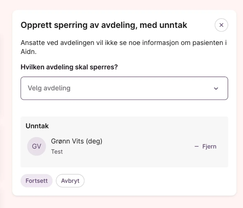 - Sperren gjelder kun innenfor valgt avdeling. Dersom pasienten mottar tjenester ved andre avdelinger, blir ikke disse påvirket.