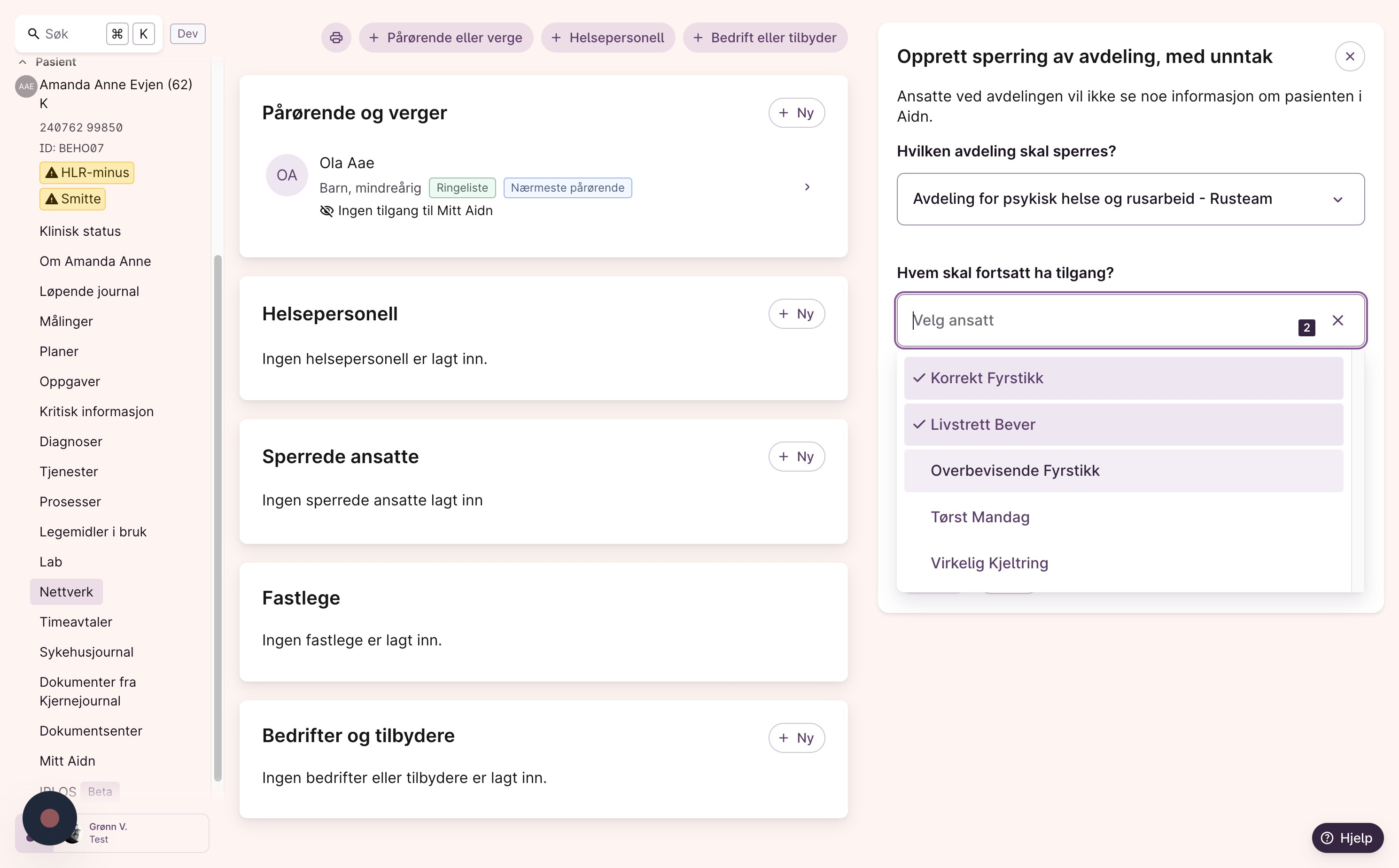 Sperrefunksjonen innenfor en avdeling i Aidn gjør det mulig å begrense tilgang til pasientinformasjon slik at kun spesifikke helsepersonell innad en avdeling får tilgang. Alle andre i avdelingen blir blokkert.