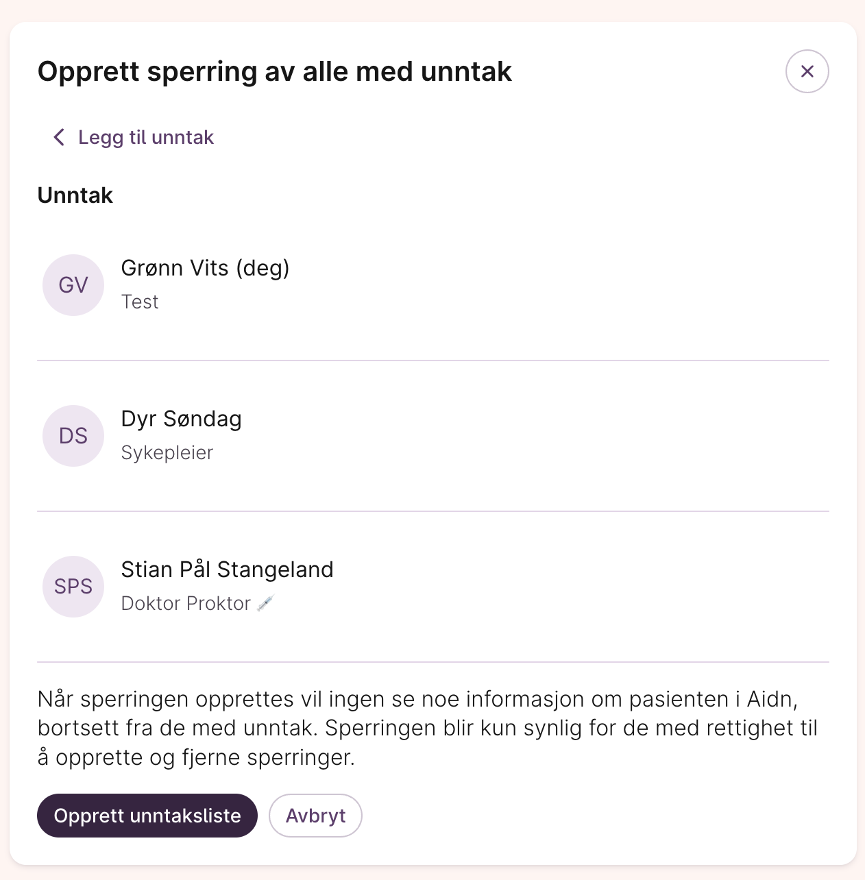 - Kun brukere under «Unntak fra sperring» kan se pasienten.