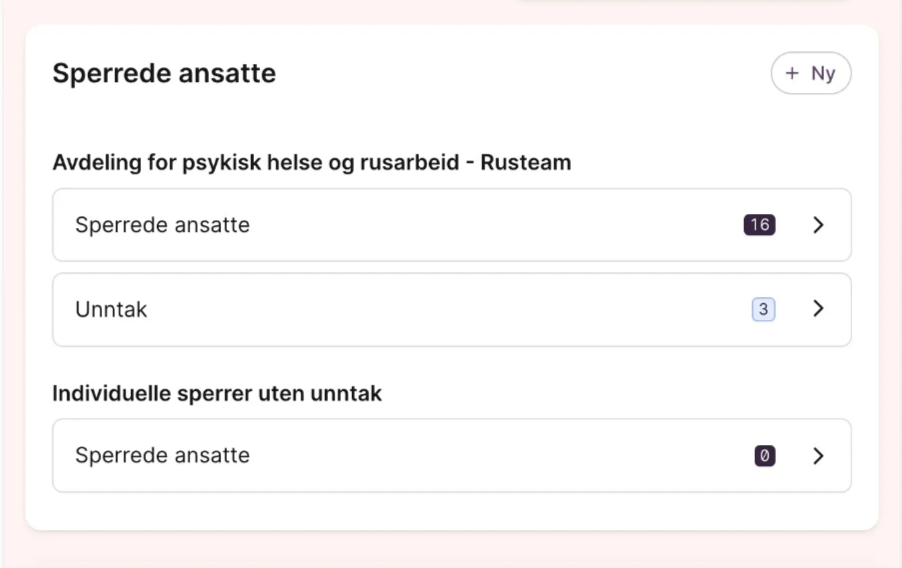 - Dersom en enkeltperson er blokkert før sperrelisten aktiveres, vises disse under «Individuelle sperrer uten unntak». Disse vil fortsatt være sperret dersom sperrelisten oppheves.